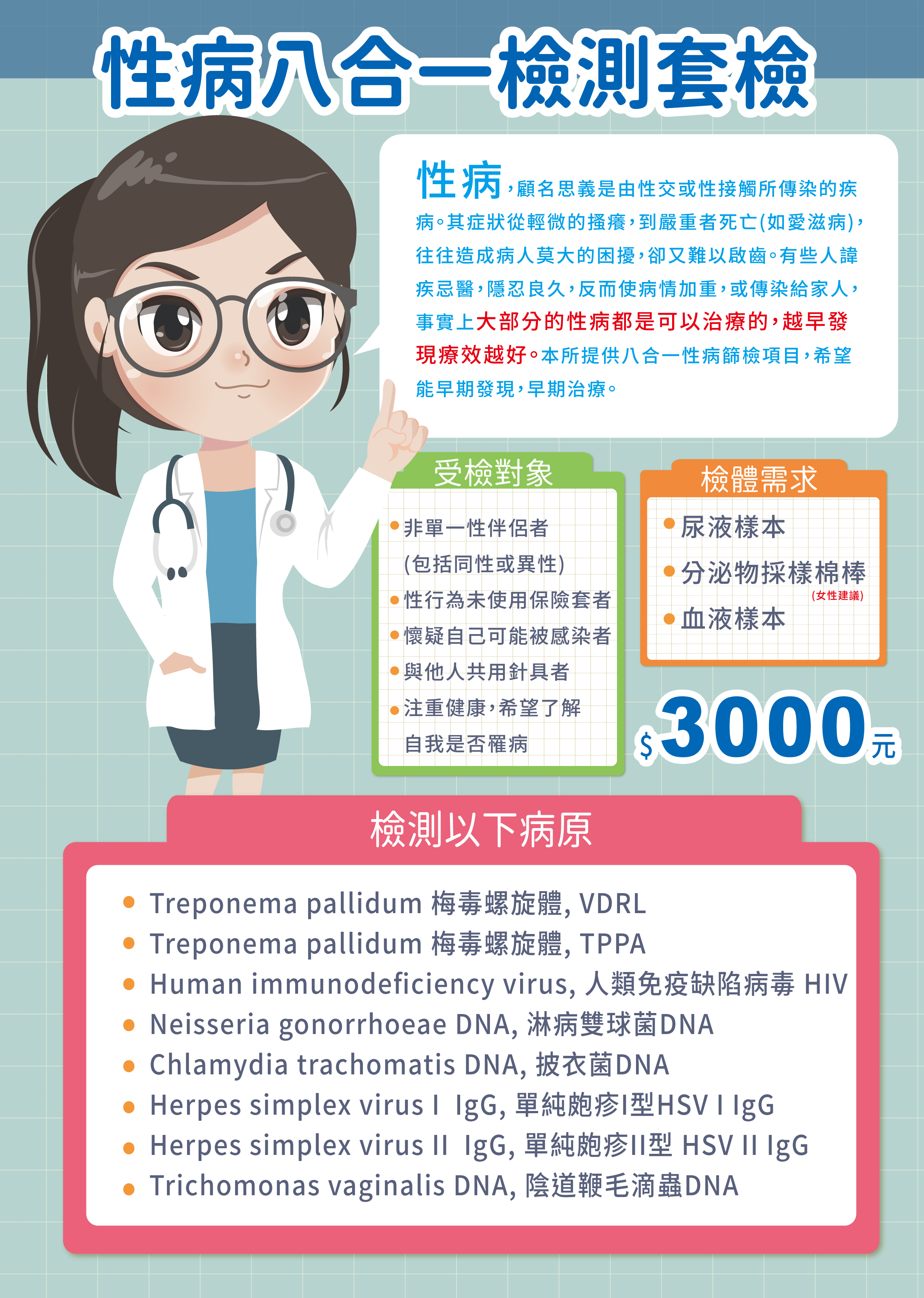 性病,顧名思義是由性交或性接觸所傳染的疾病。其症狀從輕微的搔癢,到嚴重者死亡(如愛滋病),往往造成病人莫大的困擾,卻又難以啟齒。有些人諱疾忌醫,隱忍良久,反而使病情加重,或傳染給家人,事實上大部分的性病都是可以治療的,越早發現療效越好。本所提供八合一性病篩檢項目,希望能早期發現,早期治療。